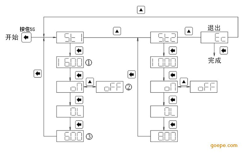 (①回路延时值)压力下降且压力≤(ST1-OL)值时,输出状态复位。 显示“OL”时,按“Å”键,进入①回路设定值设置状态,此时闪烁位为可修改位,按“▲”键,闪烁位数字可从0至9循环修改,按:“”键,闪烁位可从千位至个位循环移动。通过“▲”键、“”键,完成设定值设置,按“Å”键,延时值存储,并跳转显示“ST1。” ST2回路设定如上ST1回路设定,不再敷述。 退出 退出基本设置 显示“Ec”时,按“Å”键,退出基本设置状态