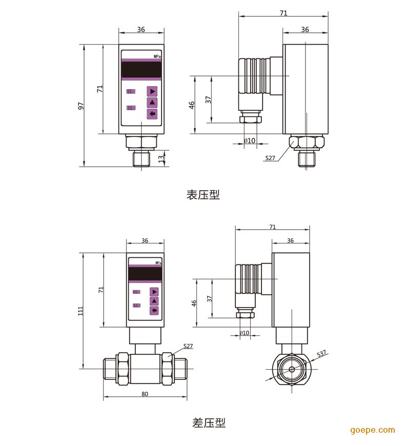 四、基本参数基本参数 电源 DC24V±5% 量程范围 -0.1-100MPa 可设定范围 20%FS-80%FS(*佳) 过载 150%FS 显示 四位LCD 显示精度 0.5%FS 重复性误差 ≤0.3%FSmax 温度漂移 ≤0.1%FSmax 外壳防护等级 IP54 模拟输出 4-20mA 负载≤600欧姆 精度0.5%FS 输出方式 类型 PNP晶体管输出、SPST开关量输出 动作寿命 >100万次 响应时间 动作时间:15ms 释放时间:8ms 过程连接 不锈钢304# G1/4”(常规) 环境条件 介质温度 -25-80℃ 环境温度 -25-80℃