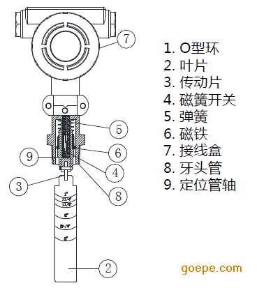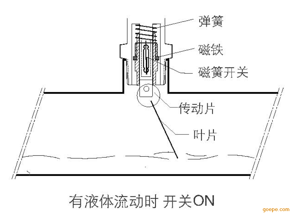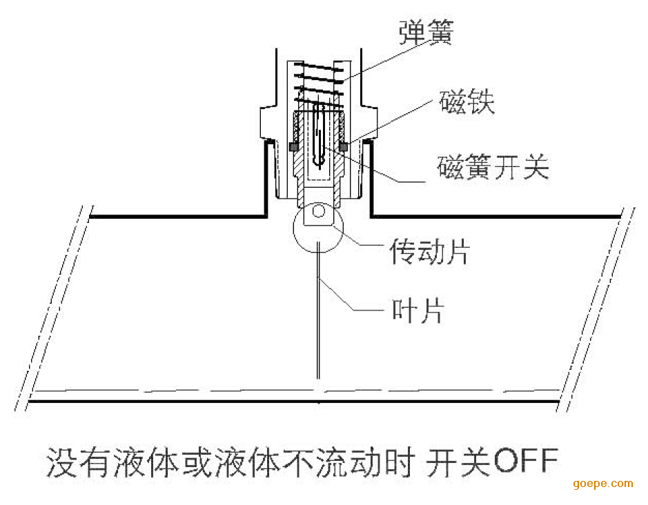 TX-WF16系列防爆流量开关是利用水的流动力量带动叶片,来测试管内液体是否流动,当液体在管路内没有流动时,弹簧将磁铁往下压叶片成垂直,此时磁簧开关无动作,接点在常开(NO)位置。当管路内有液体流动且液体流量足以将叶片推高约20°~30°时,叶片上方至偏心传动片将磁铁往上推,而磁铁的吸力使磁簧开关动作,此时接点接通(close)。由于管径的不同叶片长度也要随之改变。
